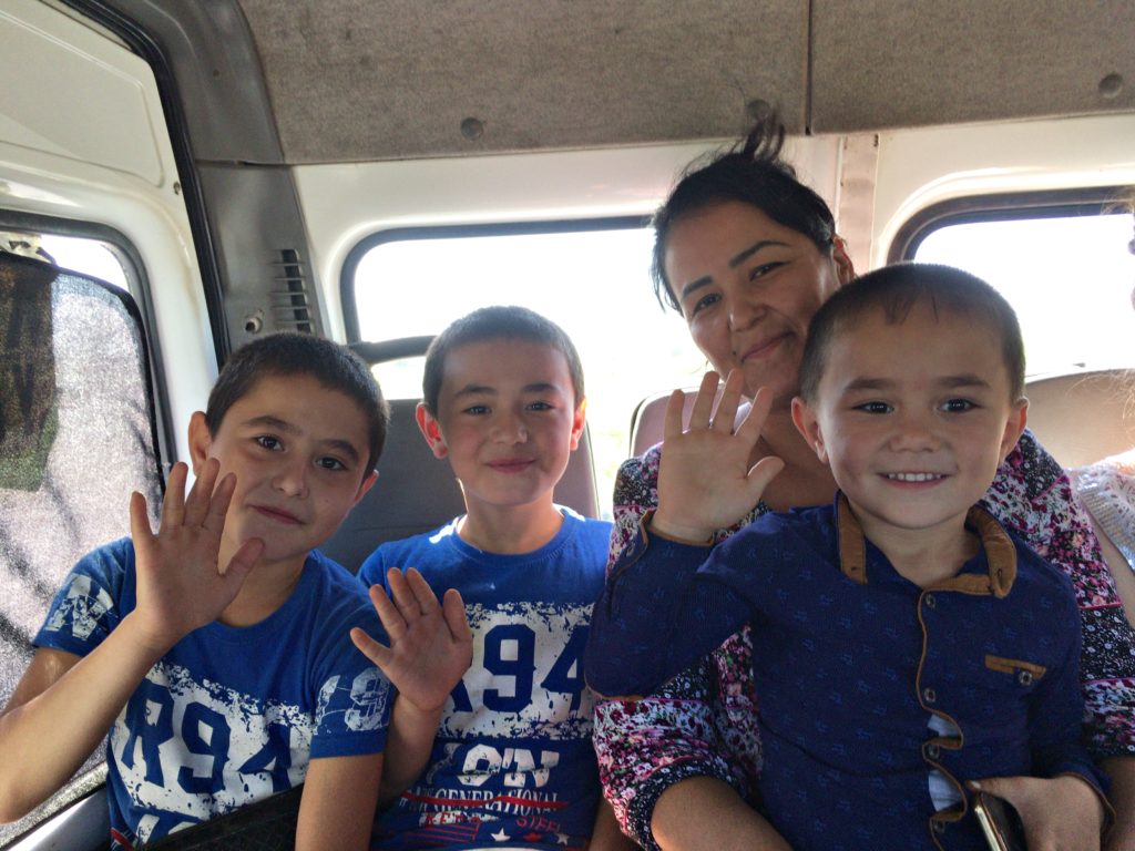 ヒヴァへ向かうマルシュルートカ(小型の乗合ワゴン)の中で出会った家族。