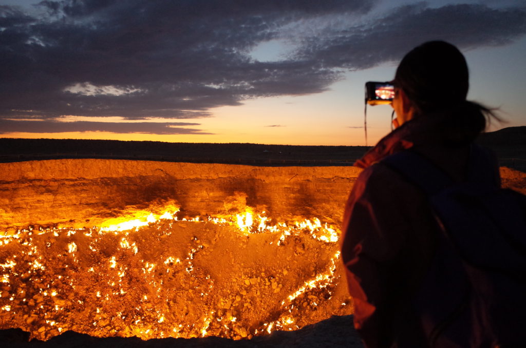 1971年、旧ソ連の地質学者ボーリング調査を行った際、落盤事故が起き巨大なクレータができ上がった。そこから噴き出す有毒ガス(たぶんメタン)を食い止めるために火を放ったところ、もう40年以上も燃え続けているらしい。