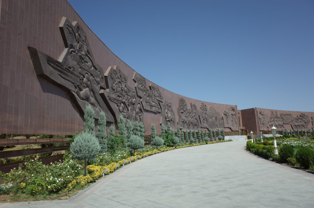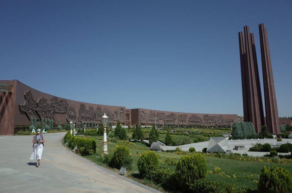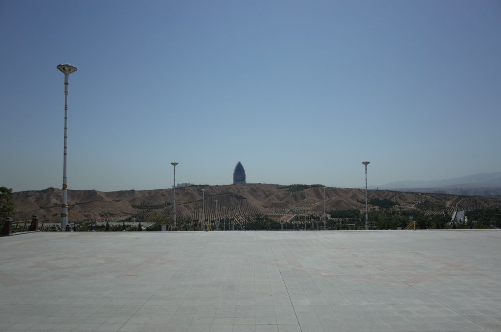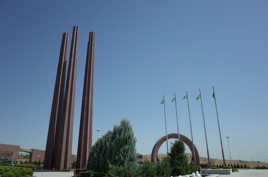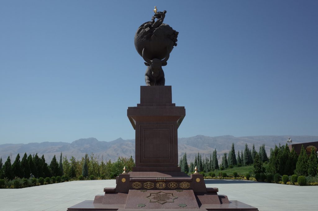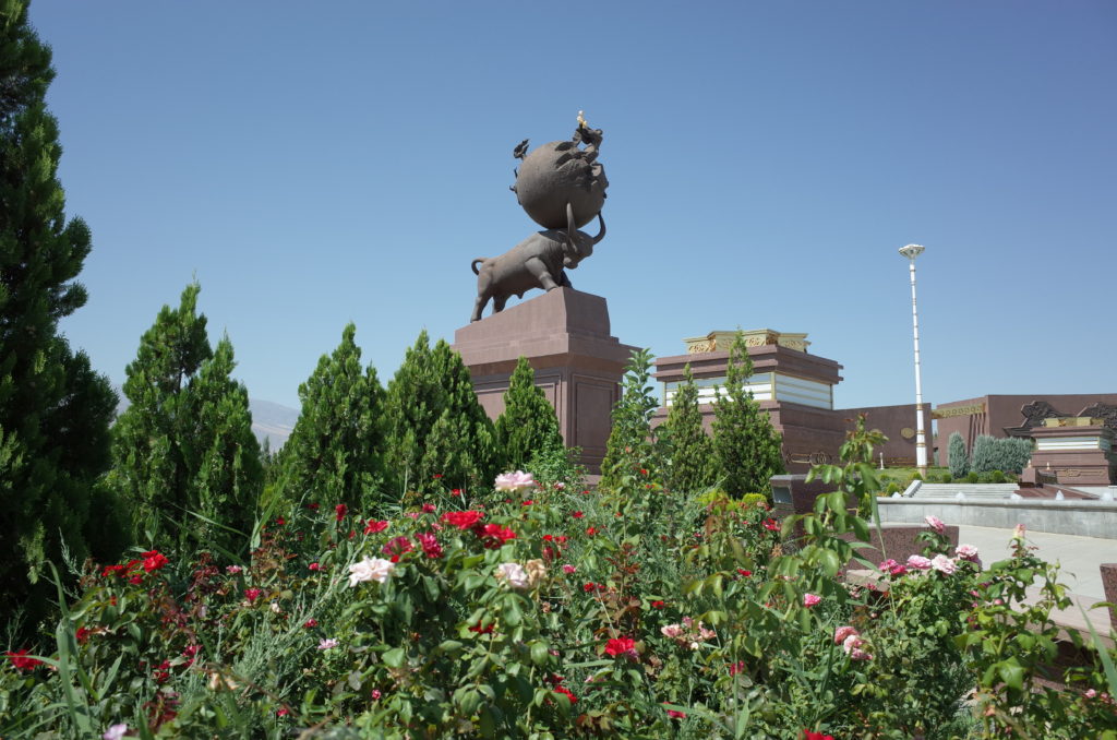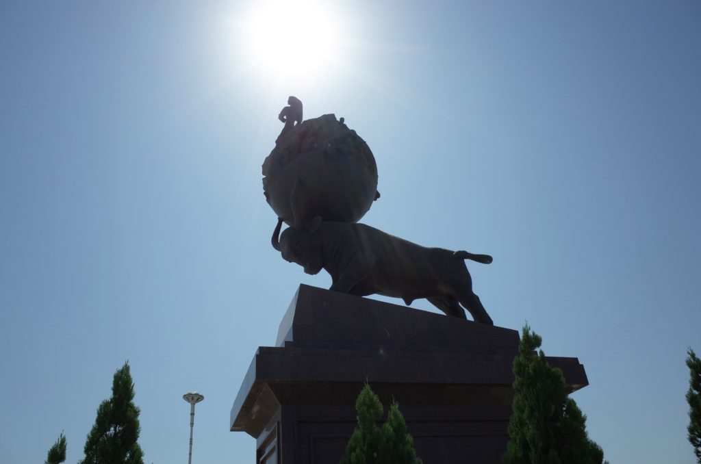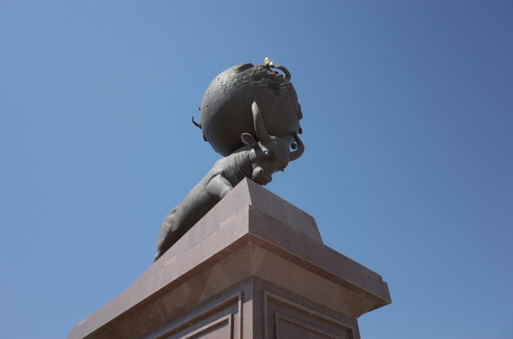 アシガバードは、1948年に大地震を経験している。発生時には死傷者数が公表されなかったことから、ソ連の核実験という噂もあったらしい。地震が多い国なので、耐震強度が高い街をつくるために、総大理石の建物をつくり始めた経緯もあるよう。雄牛の角の上に、地球のような球体。その裂け目には、必死で金色の男の子を持ち上げる女性。ガイドは、「地震が牛によって引き起こされていると考えられていた」みたいな(適当な)説明をしていたけれど、地球が巨大な牛によって運ばれていたと信じていた伝説があるみたい。