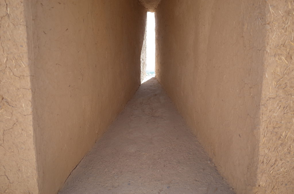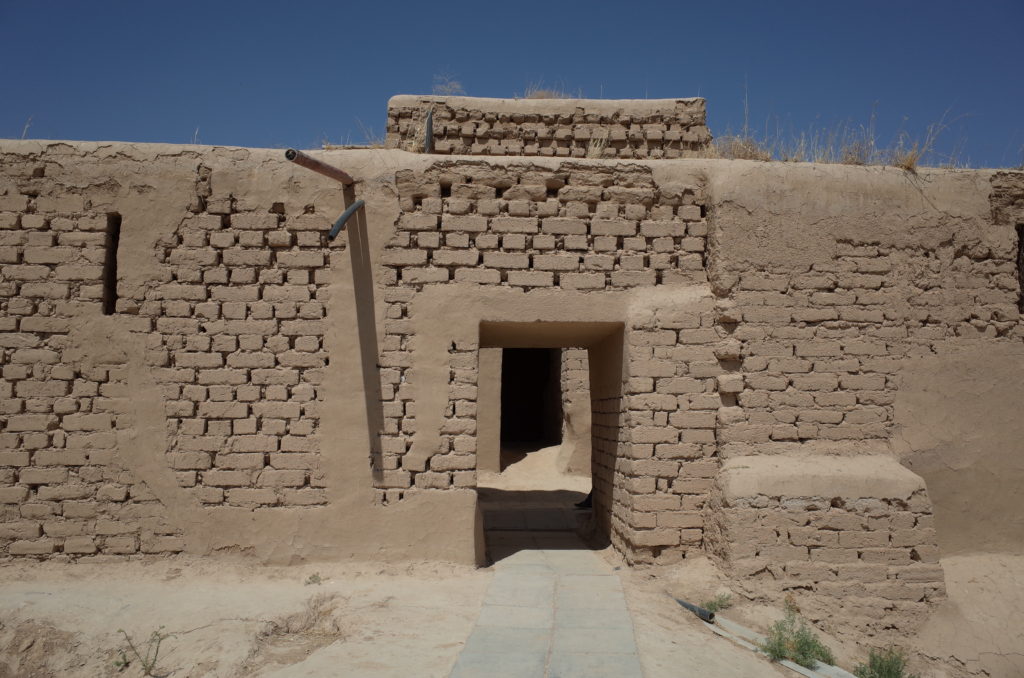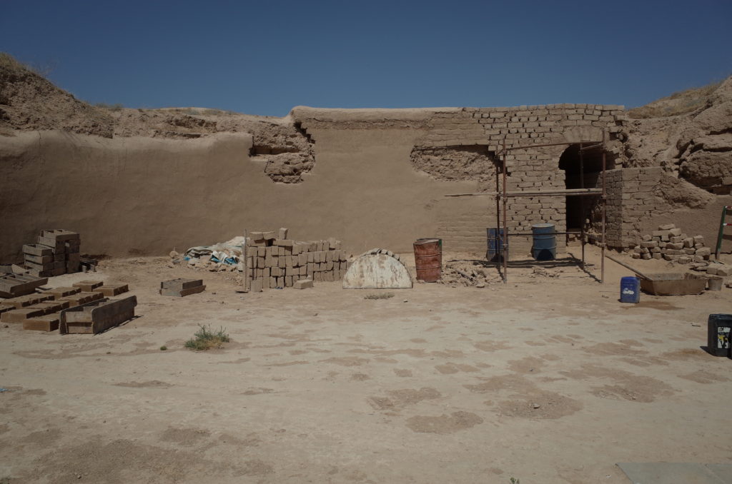 ゾロアスター教神殿の跡地。あちこち復元中。修復用の日干しレンガが置いてある。左奥がちょっと丸くなっているとおり、ドーム型の建造物だったみたい。