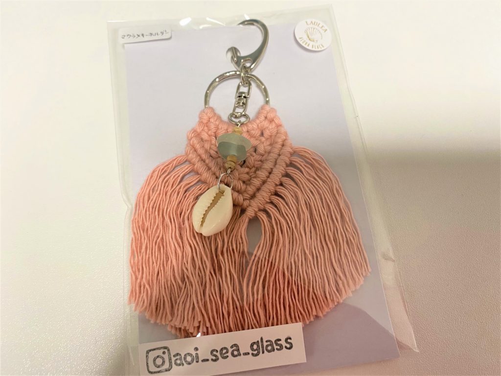 息子さんがCOACHで働いていた夫の職場の方に結婚祝いでもらったキーケースが壊れて以降、ずっと鍵をそのまま持ち歩いていた私。念願のキーホルダーをゲット。マクラメシーグラス。やっと難民脱出。
