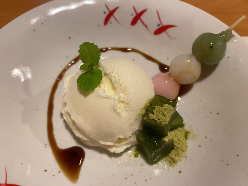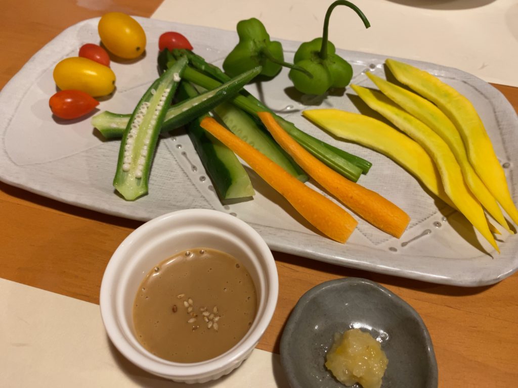 そしてこれ!がとてもおいしかった。しゃきしゃきのあまーい高原野菜をゴマ?のソースにつけて食べます。塩レモンもあります。上の茎が伸びている緑のは、ベルピーマン。初めて見た・知った野菜。丸ごとぱくっと。右の黄色いのはコリンキー。私はコリンキーが一番好きだったな。