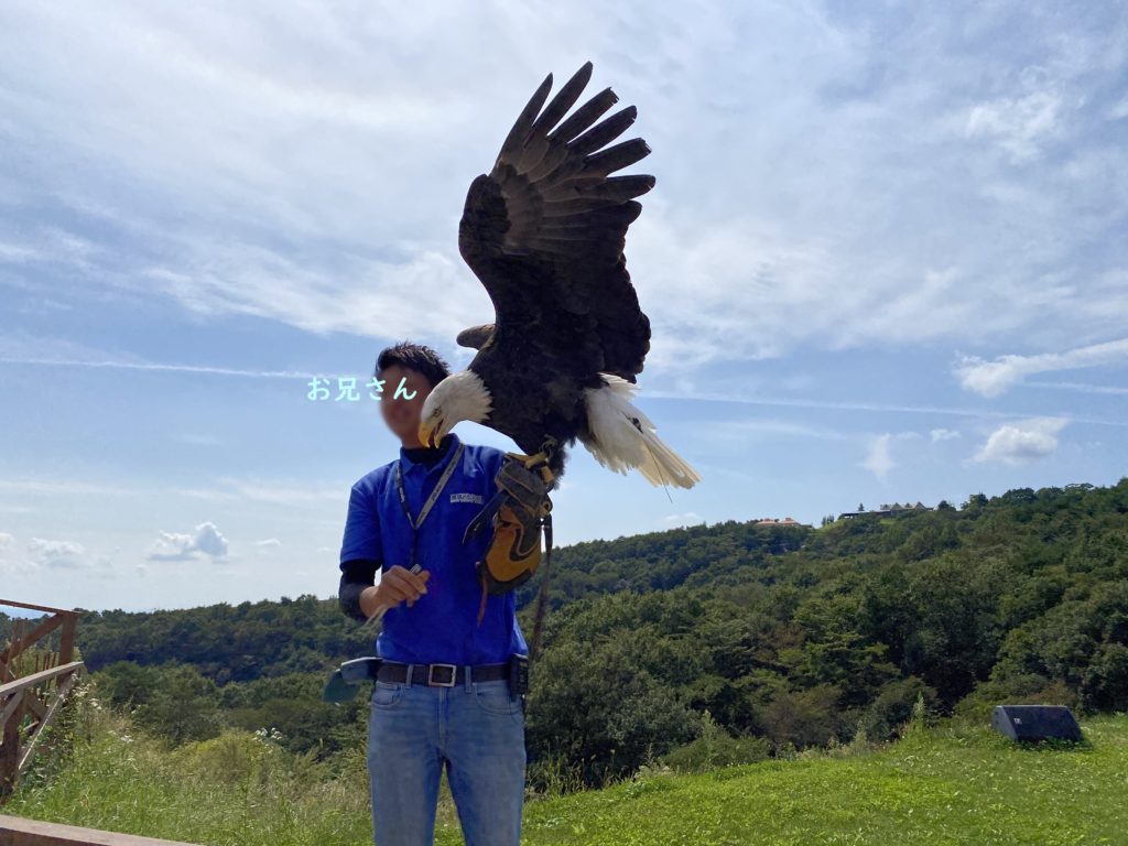 それがこれ…。なんてこったーーーーー!!!観客の頭上すれすれを猛スピードで飛び回るダルマワシ。後ろの小屋から連れてこられると思った鳥は、遠くの山から飛んでくるは、前方の芝生スペースで繰り広げられると思っていたショーは、普通に私たちの頭上で行われるは、夫と2人で唖然。でも大興奮!!!
