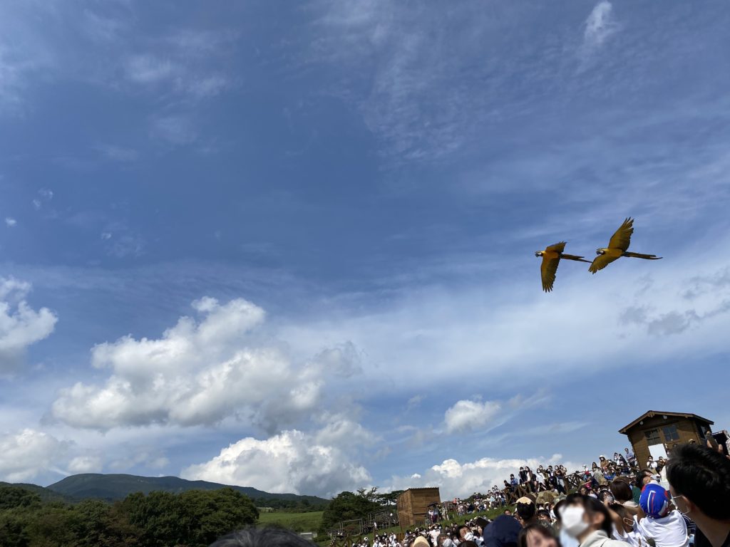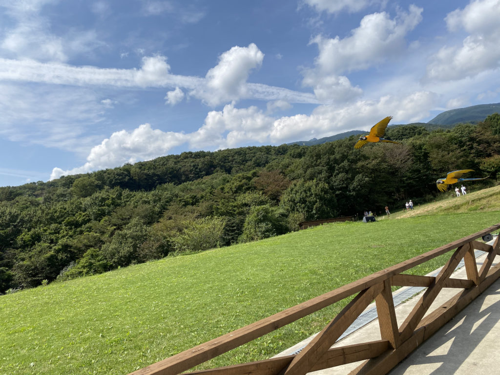 やっと到着したのは、やたら開けた広いエリア。何やらちょうどこの後、すぐそこでショーがあるらしい。人が続々とそっちに向かっていく。せっかくなら我々も観よう!ということで、最前列の席を確保。だがしかし、「バードパフォーマンスショー」と言っている…。いやいや私、本当に鳥が苦手。小学校の飼育係とか死んでもやりたくないタイプ。でもせっかくだからという夫に押し切られ、しぶしぶ。。屋外に半円状の席が設けられ、前方に柵があり、ステージ代わりの芝生のスペース。席の後方に小屋があって、ケージが見えていたので、ああ、ここから鳥が連れてこられてステージ上で見せてくれるんだなと思っていた。ここまでは。