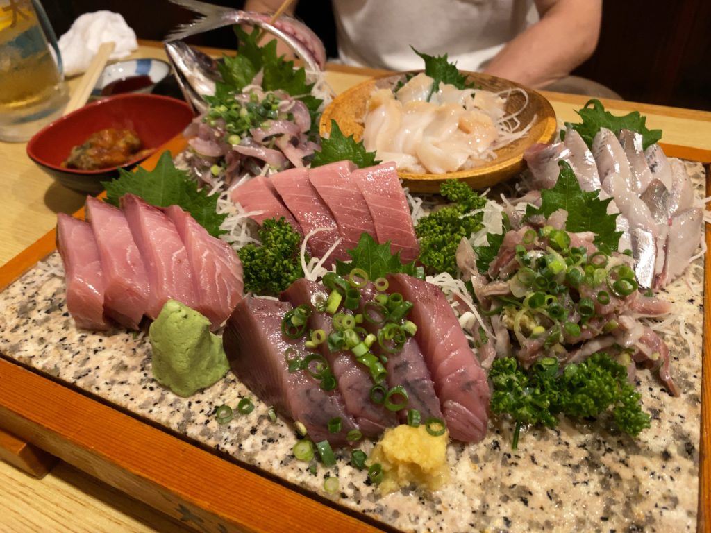 見よこの輝きを!きらきら豪華なお刺身盛り合わせ。いわし最高!私はノンアル。