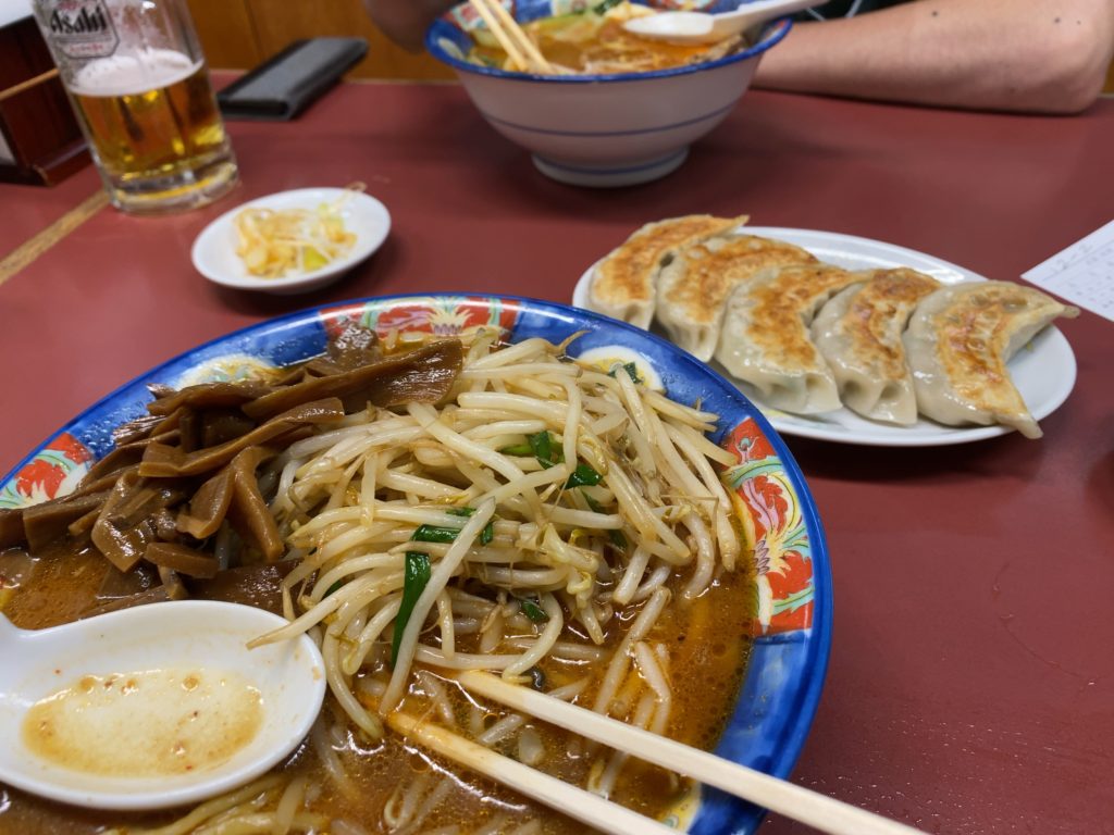 近くの町中華にて。とにかく量が多い。太麺の味噌ラーメンにメンマたっぷりと、大好きな巨大餃子。