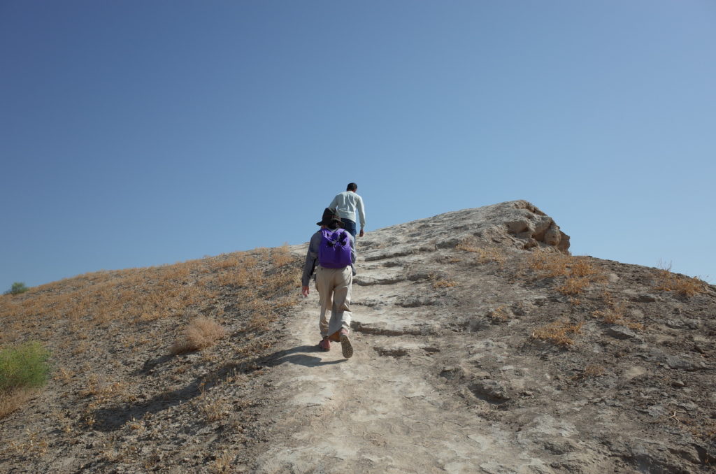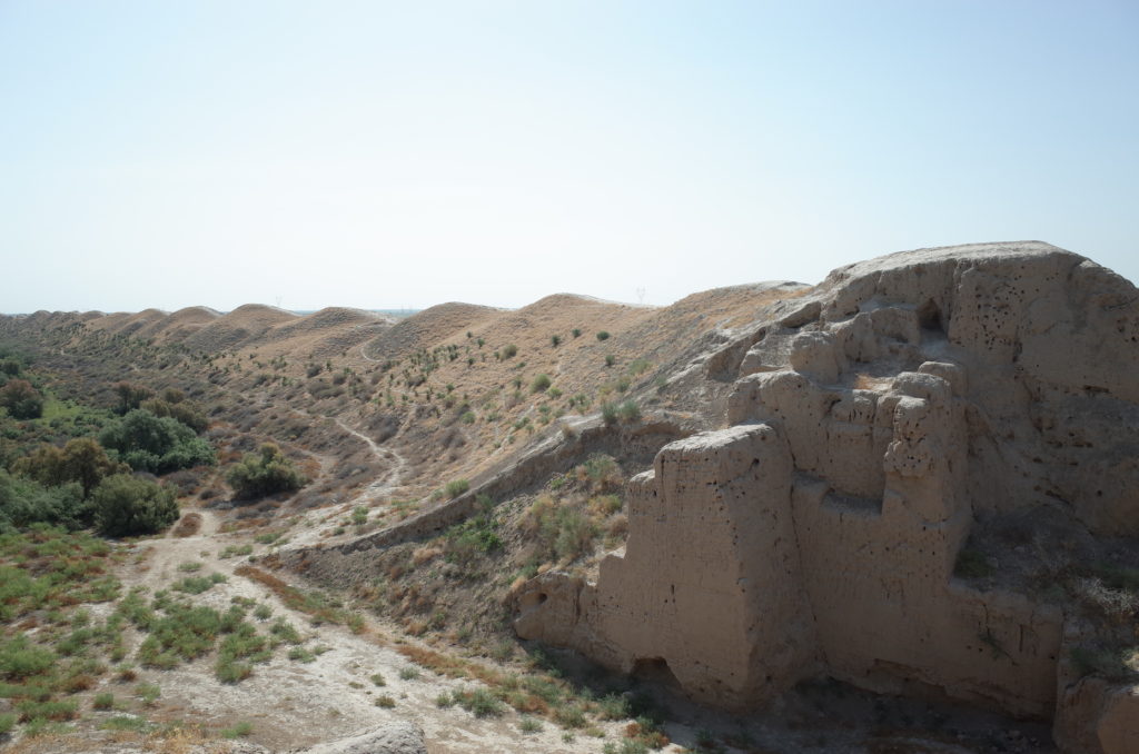 登った丘は、ギャウル・カラと呼ばれる都跡の城壁。すごい眺め。写真はほんの一部だけど、360°見渡せる。右の方に見えるのが、城壁の断面。穴は矢を射るためのものだったり、鳥の巣だったり。ずーっと続いている小高い山も城壁跡。とにかく広大。ギャウル・カラの中には、様々な宗教施設があったと言われており、特に仏教寺院はメルブから西では発見されていないため、仏教伝来最西端の地という説もあるらしい。浪漫。
